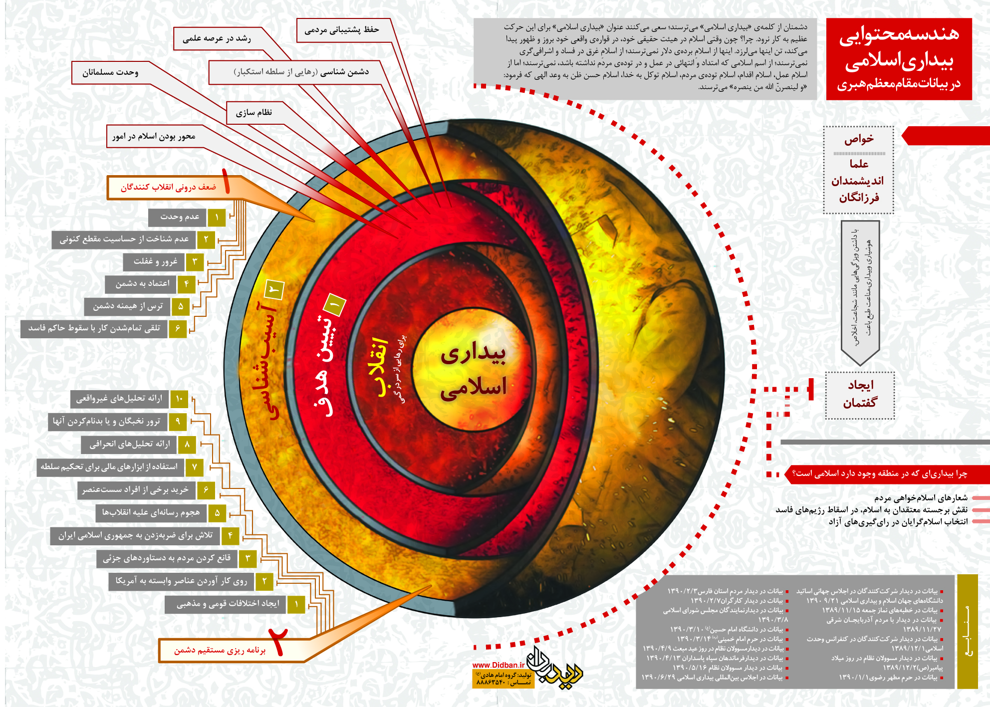 این اینفوگرافی به همت سایت دیدبان و برمبنای صحبتهای مقام معظم رهبری در دیدار شرکت کنندگان در اجلاس جهانی اساتید دانشگاه های جهان اسلام و بیداری اسلامی تنظیم شده است. برای دیدن آن اینجا کلیک کنید.